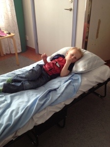 Medan Meya vilade i soffan med mommo, fixade vi i ordning hennes säng så den står bredvid våran. Meya fick testa och hon var helnöjd! Våra ryggar är inte lika nöjda då vi får vrida oss ur led när vi lägger ner henne, men det är värt det att få sova hemma…