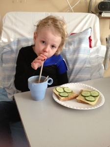 Efter att ha byggt lego och pysslat med allt möjligt för att få tiden att gå, så blev det dags för pappa att gå och städa rummet och då blev det -äntligen- dags för sista kvällsfikan på drottning Silvias sjukhus för denna gång..