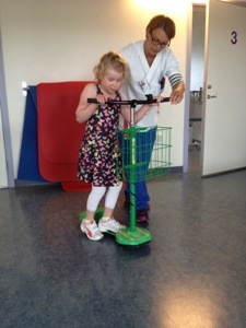 Efter det var det ett pass i gympasalen. Meya slog rekord på motioncykel (30 tramptag), gick 3 varv på hinderbana där hon hoppade studsmatta mellan varven, ca 50 studsar total. Efter det körde hon rekord på handcykeln och gick 1 minut på gåbandet. Hon avslutade med sin egen uppfunna häst och vagn-lek 🙂 Superhårt kämpat!
