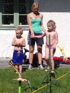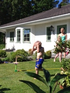I veckan fick barnen en vattenspridar-leksak i form av en stor blomma som man kopplar in en vattenslang till så den sprutar vatten vilt omkring sig. Meya har haft en sådan för flera år sedan, men den gjorde Mantra om till små bitar skumgummi. Denna nya och bättre version testades in på lördagen. Det var inte den varmaste dagen, eftersom det blåste lite snålt, men trots en del huttrande hade de väldigt kul och det blev omprov på eftermiddagen. Max går själv och kopplar in alltihop och startar, sen ropar han på Meya för att få lite stöd för sitt påhitt..