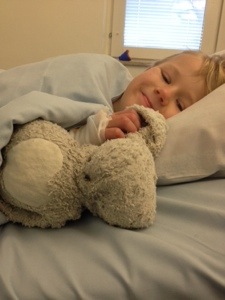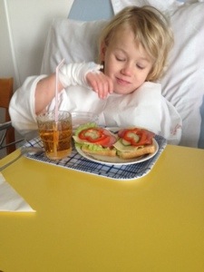 Efter att ha sovit en stund till tjatade hon om att få äta och dricka, hon hade ju inte ätit något sen igår… En glad och nöjd tjej fick äta sina rostade mackor med ost, prickig korv och massa grönsaker på. Men det blev äppeljuice istället för varm oboy som hon alltid fick i våras.